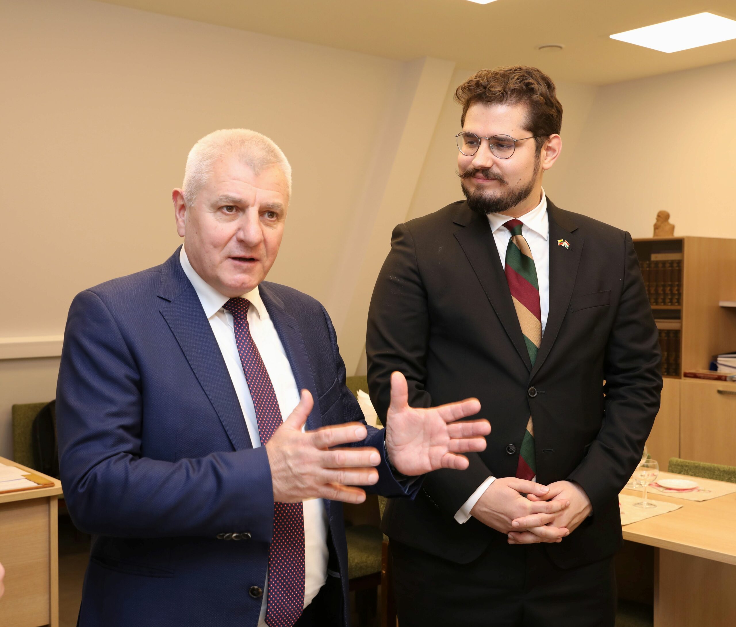 Spalio 30 d. LMA Vrublevskių biblioteką aplankė aukšti svečiai: J. E. Vengrijos ambasadorius Lietuvai dr. Jánosas Béresas ir Vengrijos diplomatinės atstovybės vadovas p. Dénesas Andrásas Nagy’s. Svečius sutiko Bibliotekos direktorius dr. Sigitas Narbutas ir mokslinė sekretorė Leokadija Kairelienė. Šeimininkai ambasadorių ir atstovybės vadovą supažindino su Bibliotekos istorija, statybos darbų eiga ir numatomais pokyčiais po jų atvėrus Biblioteką visuomenei. Aukštieji svečiai pareiškė norą palaikyti kultūrinius ryšius, taip pat informavo apie ketinimus 2026 m. pažymėti 500-ąsias lemtingų Mochačo kautynių metines. Bibliotekos darbuotojos Erika Kuliešienė ir Violeta Radvilienė svečiams parodė įspūdingų dokumentų, liudijančių apie daugiau kaip 500 metų skaičiuojančius Lietuvos ir Vengrijos valstybinius, politinius, kultūrinius, ekonominius ir kitokius ryšius.