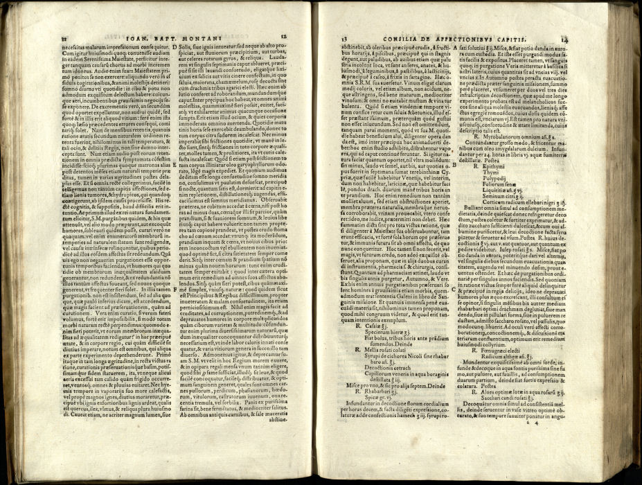 Da Monte, Giovanni Battista (1498–1551). Consultationum medicarum opus absolutissimum : in quo ad consilia omnia prius edita, ea que singulari cura, diligentia & fide nunc emendata, accesserunt centum fere nunquam antea typis expressa, luce atque lectione omnium studiosorum artis medicae dignissima / studio atque opera Ioannis Cratonis Vratislaviensis, medici caesarei. – Basileae [Basel] : per Henricum Petri et Petrum Pernam, 1565. – [10] lap., 1024 skl.: inic., portr. ; 2° (32 cm).
