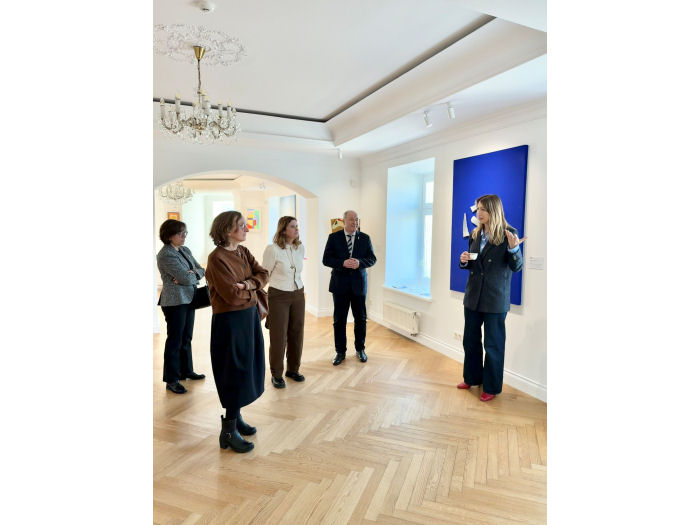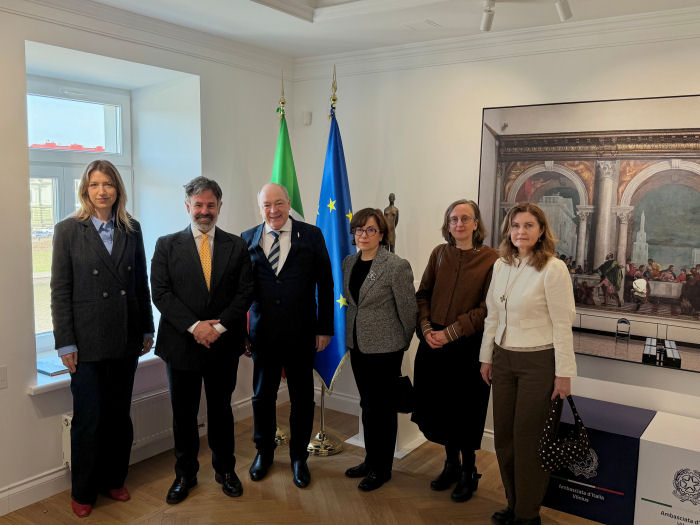 J. E. Italijos ambasadoriaus Emanuele de Maigret kvietimu 2026 m. balandžio 14 d. Italijos ambasadoje apsilankė Bibliotekos direktorius dr. Sigitas Narbutas, direktoriaus pavaduotoja mokslui dr. Rima Cicėnienė, Dokumentų konservavimo ir restauravimo skyriaus vedėja Edita Keršulytė ir Komunikacijos skyriaus vedėja Inga Berulienė. Svečius šiltai priėmė J. E. Italijos ambasadorius, taip pat Italijos kultūros instituto darbuotoja Giedrė Bagdžiūnaitė. Priėmimo metu kalbėtasi dėl renginio, kuriuo šių metų rudenį bus pagerbta Lietuvos ir Italijos diplomatinių santykių užmezgimo 25 metų sukaktis, taip pat susipažinta su vertinga šiuolaikinių Italijos dailininkų kūrinių ekspozicija. Agnės Babrauskaitės nuotraukos.